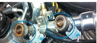 故障原因已經(jīng)找到,但具體是哪個部件的問題呢?既然已經(jīng)更換過汽油泵,那就不太容易出現(xiàn)新油泵不保壓的現(xiàn)象,檢查汽油管路,未發(fā)現(xiàn)泄漏。那么噴油器是否存在漏油現(xiàn)象呢?拆卸噴油器,進行保壓試驗,發(fā)現(xiàn)2個噴油器確實存在明顯漏油現(xiàn)象(如圖4所示),更換噴油器,故障排除。