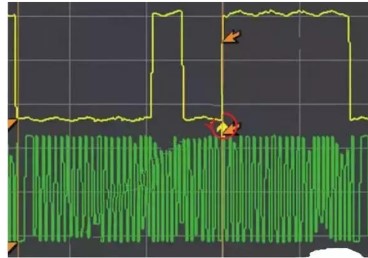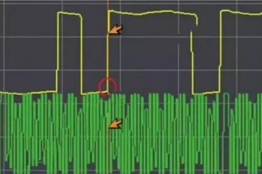 圖 4 中綠色為曲軸波形,黃色為凸輪軸波形。凸輪軸波形一個(gè)周期內(nèi)以兩寬兩窄的形式出現(xiàn)。曲軸信號(hào)輪共 58 齒,第一個(gè)寬波出現(xiàn)在第 34 齒(如圖 5 所示)。