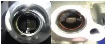 通過以上的數(shù)據(jù)采集來分析,故障原因確定為曲軸和凸輪軸兩個(gè)相對(duì)位置出錯(cuò),但到底是凸輪軸方面存在問題,還是曲軸信號(hào)輪位置發(fā)生偏移,只有通過拆裝才能加以確定。因檢查曲軸位置信號(hào)輪需要拆裝變速器,工作量大,所以決定從簡單的入手,先檢查凸輪軸信號(hào)輪。經(jīng)檢查發(fā)現(xiàn)凸輪軸信號(hào)輪位置存在偏差,所以故障點(diǎn)位置確定為凸輪軸信號(hào)輪位置偏移,如圖 8 所示(左側(cè)為正常車輛一缸工作時(shí)凸輪軸靶輪位置,右側(cè)為故障車輛靶輪位置)。
