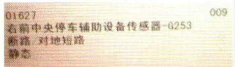 檢查分析:維修人員接車后確認(rèn)故障現(xiàn)象,掛入倒擋,停車輔助系統(tǒng)蜂鳴器常響,多媒體屏幕不顯示輔助系統(tǒng)監(jiān)測前后障礙物的模擬畫面。清潔雷達(dá)傳感器表面,無效。用診斷儀讀取停車輔助系統(tǒng)的故障碼,顯示故障為“右前中央停車輔助傳感器斷路/對(duì)地短路,靜態(tài)”(圖1)。用手觸摸各個(gè)停車輔助傳感器,發(fā)現(xiàn)除了右前中央停車輔助傳感器沒有振動(dòng)感外,其他傳感器全部正常?;九懦\囕o助系統(tǒng)控制單元故障的可能。