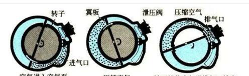 圖上所示為空氣泵的工作過程。由圖可見,由于轉子帶動翼板旋轉,使空氣泵內(nèi)的壓力低于進氣口外的壓力,所以空氣被吸入空氣泵。轉子繼續(xù)帶動翼板旋轉,使空氣被壓縮并流動到排氣口,此時由于排氣口外的壓力比排氣口內(nèi)的小,而且還有.冀板的推動作用,最終使空氣從排氣口排出??諝獗霉ぷ鲿r,這一過程周而復始,將空氣連續(xù)不斷地泵入排氣系統(tǒng)。