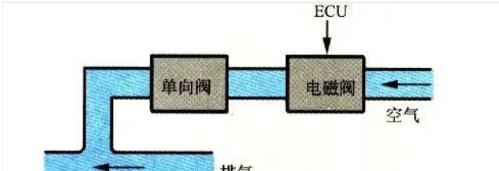 二次空氣又分為上游氣流及下游氣流。上游氣流進入排氣歧管,下游氣流流進轉換器中的空氣室中,空氣進入排氣歧管及三元催化轉換器的時機由發(fā)動機控制模塊(ECU)進行控制。