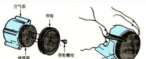 2)此外空氣泵在皮帶輪的后面有一個離心式濾清器,空氣通過濾清器將灰塵過濾后流入氣泵。皮帶輪與濾清器用螺栓連接在泵軸上,可分別檢修它們,如下圖所示。如果皮帶輪或濾清器彎曲、磨損或損壞,應將其更換。