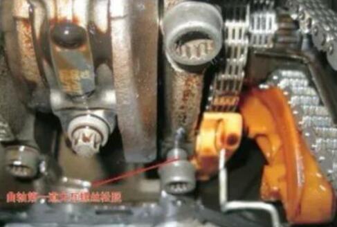 維修站的維修技術人員首先試車啟動發(fā)動機,發(fā)現(xiàn)發(fā)動機啟動瞬間有“嗒嗒”的響聲,比正常發(fā)動機的啟動聲音要尖銳。維修人員將汽車舉升后掛擋位起步試車,異響較明顯,聽聲音好像是從發(fā)動機與變速器連接部位產(chǎn)生的,判斷為飛輪的震動產(chǎn)生的異響。但是當維修人員更換新的飛輪后再次試車,故障還是存在。于是打開發(fā)動機油底殼后仔細檢查,發(fā)現(xiàn)曲軸的一個主軸承蓋緊固螺栓松動(如圖所示),造成曲軸軸承異響。維修人員更換螺栓并緊固后,試車,異響
