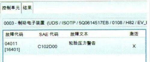 檢查分析:經(jīng)過與用戶溝通得知,該車經(jīng)常出現(xiàn)輪胎壓力的報(bào)警提示。接下來,維修人員使用診斷儀檢查控制單元的故障碼,發(fā)現(xiàn)制動(dòng)系統(tǒng)控制單元中存在1個(gè)故障碼C102D00,其含義為“輪胎壓力警告”(圖1)。