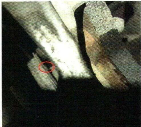將后軸左右兩側(cè)的車輪進(jìn)行互換,經(jīng)過試車故障還是存在,表明故障不是由于輪胎問題引起的。將后軸左右車輪的輪速傳感器互換,試車故障依舊,表明也不是由于輪速傳感器引起的。拆卸右后輪制動(dòng)分泵檢查右后輪軸承的信號(hào)環(huán),發(fā)現(xiàn)軸承信號(hào)環(huán)處存在一個(gè)臟點(diǎn)(圖3)。難道故障與此有關(guān)?于是清洗軸承信號(hào)環(huán),隨后試車發(fā)現(xiàn)右后漏氣輪胎指示器的數(shù)據(jù)變?yōu)?55。
