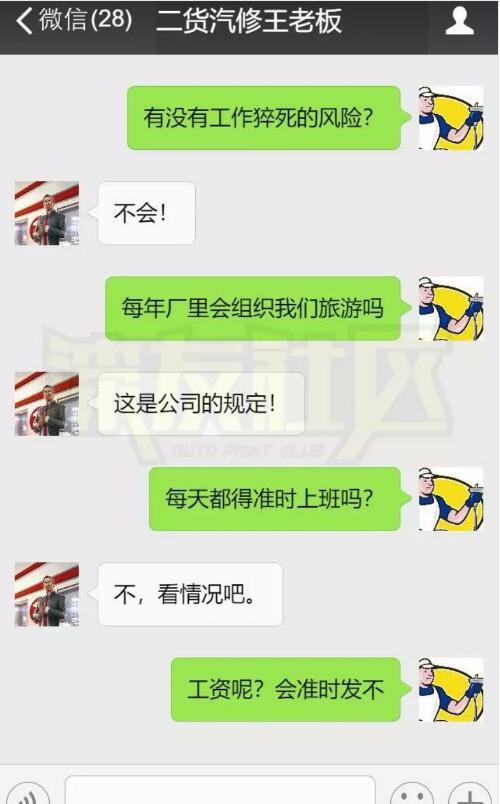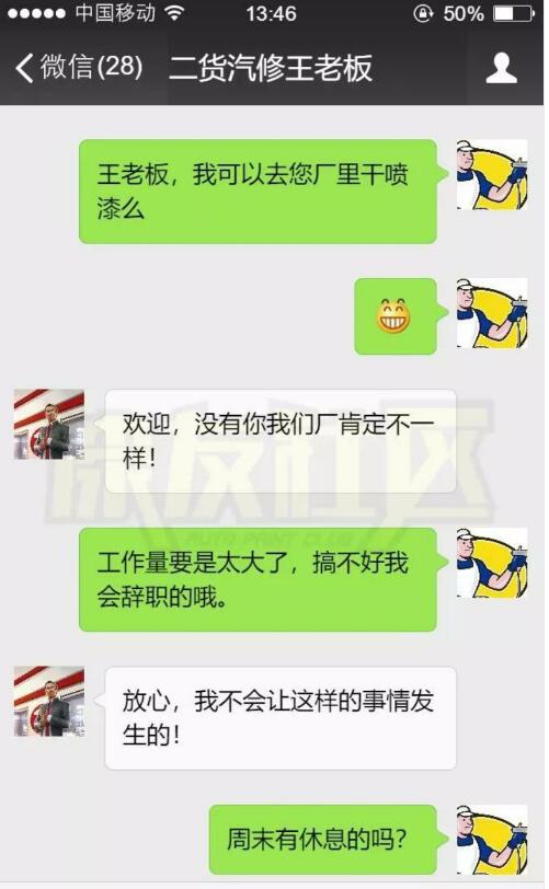 是一位汽修工與老板的微信聊天截圖