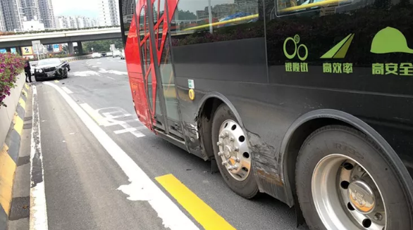 拱北交警梁警官迅速趕到現(xiàn)場(chǎng),看到事故發(fā)生在前山立交二層右轉(zhuǎn)匯入主道路段,賓利小車水箱爆裂,左側(cè)車頭保險(xiǎn)杠被掀起,上面還有好幾個(gè)大洞,地上都是碎片渣子。而停在幾米外的公交車,右后輪兩邊車身有長(zhǎng)達(dá)一米的刮痕。▼