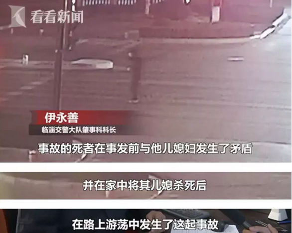 臨淄交警大隊(duì)肇事科科長(zhǎng)伊永善介紹,死者在事發(fā)前與兒媳婦發(fā)生了矛盾,在家中將其兒媳殺死,接著出門了,就在外面來(lái)回游蕩時(shí),事故發(fā)生了。