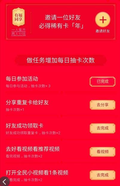 2、如果你覺得每天三次機(jī)會不好集齊的話,可以做任務(wù)每日增加抽獎次數(shù)。這里面「年」是稀有卡,但如果你邀請一位好友的話,是肯定可以得到的。
