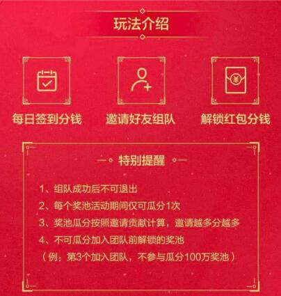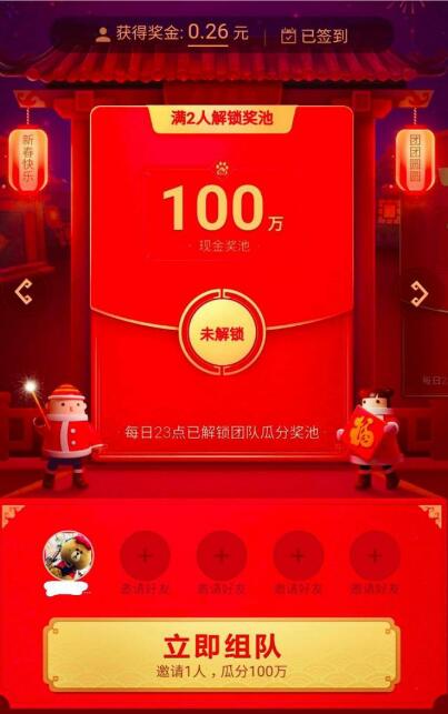 1、點(diǎn)擊立即分錢即可進(jìn)入分錢頁面,每日簽到可以獲得獎金。如果你想獲得更多錢的話,是需要邀請好友解鎖獎池的,最少可以邀請一名好友便可組隊(duì)。