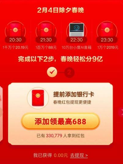 2、提前添加銀行卡,添加完銀行卡是可以領(lǐng)取一個紅包的,最多可領(lǐng)取688元。第二步完成之后就不用管這部分了,靜等2月4日的20:30、21:30、22:30、23:30分九億即可。